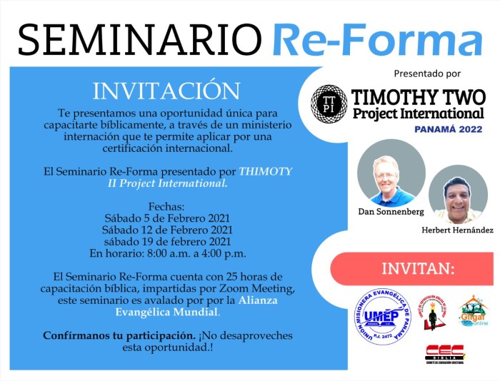 PANAMA. Last Saturday, 2/12/22, was the second of four days of training these pastors and spouses who are located in various parts of the country via Zoom. They pastor churches in the Evangelical Missionary Union of Panama and will use this training to equip other pastors in their organization. Their churches currently remain closed due to pandemic restrictions, but they are using many types of social media to preach, teach, counsel and fellowship with their members. Visit our Timothy Two Project International website.